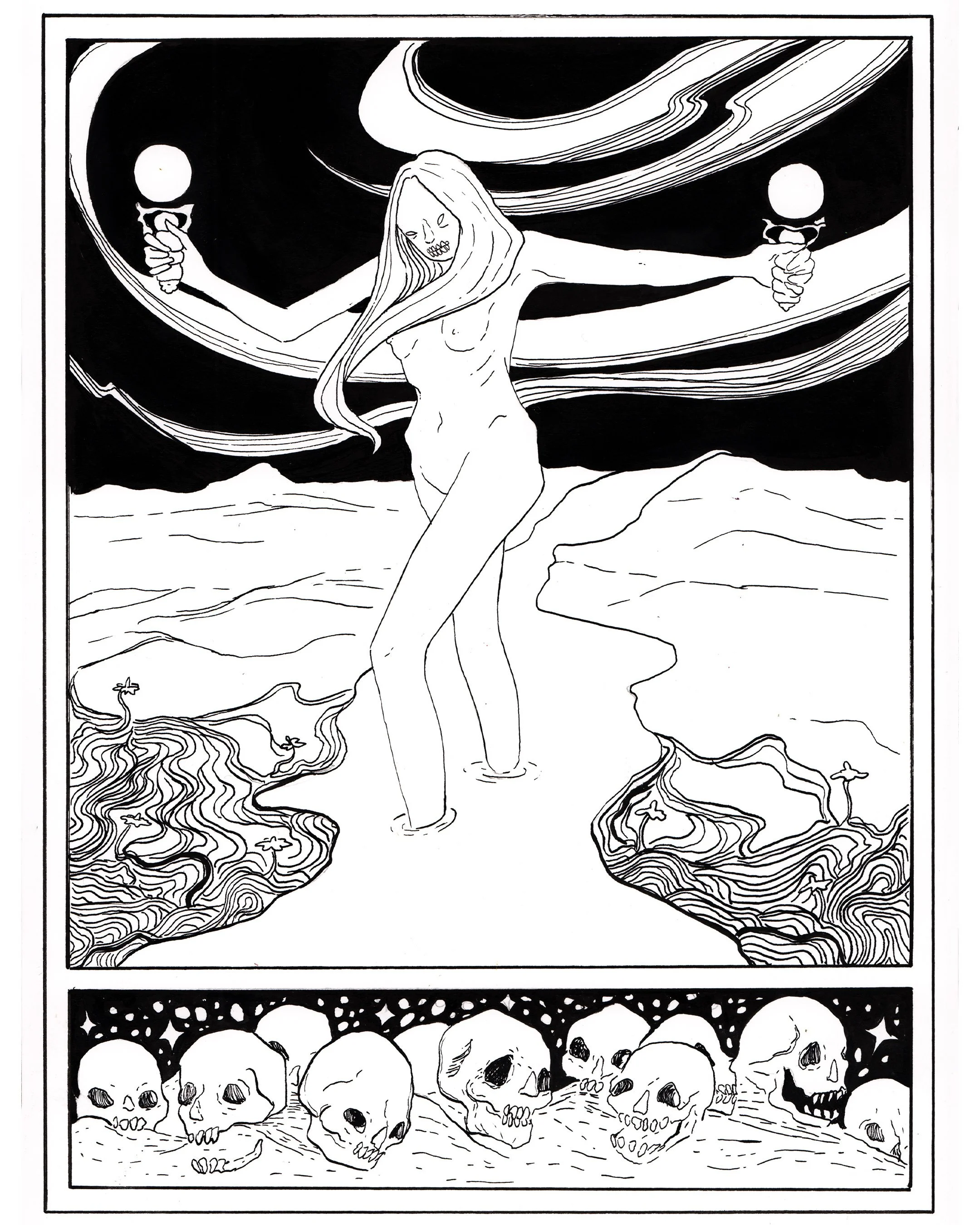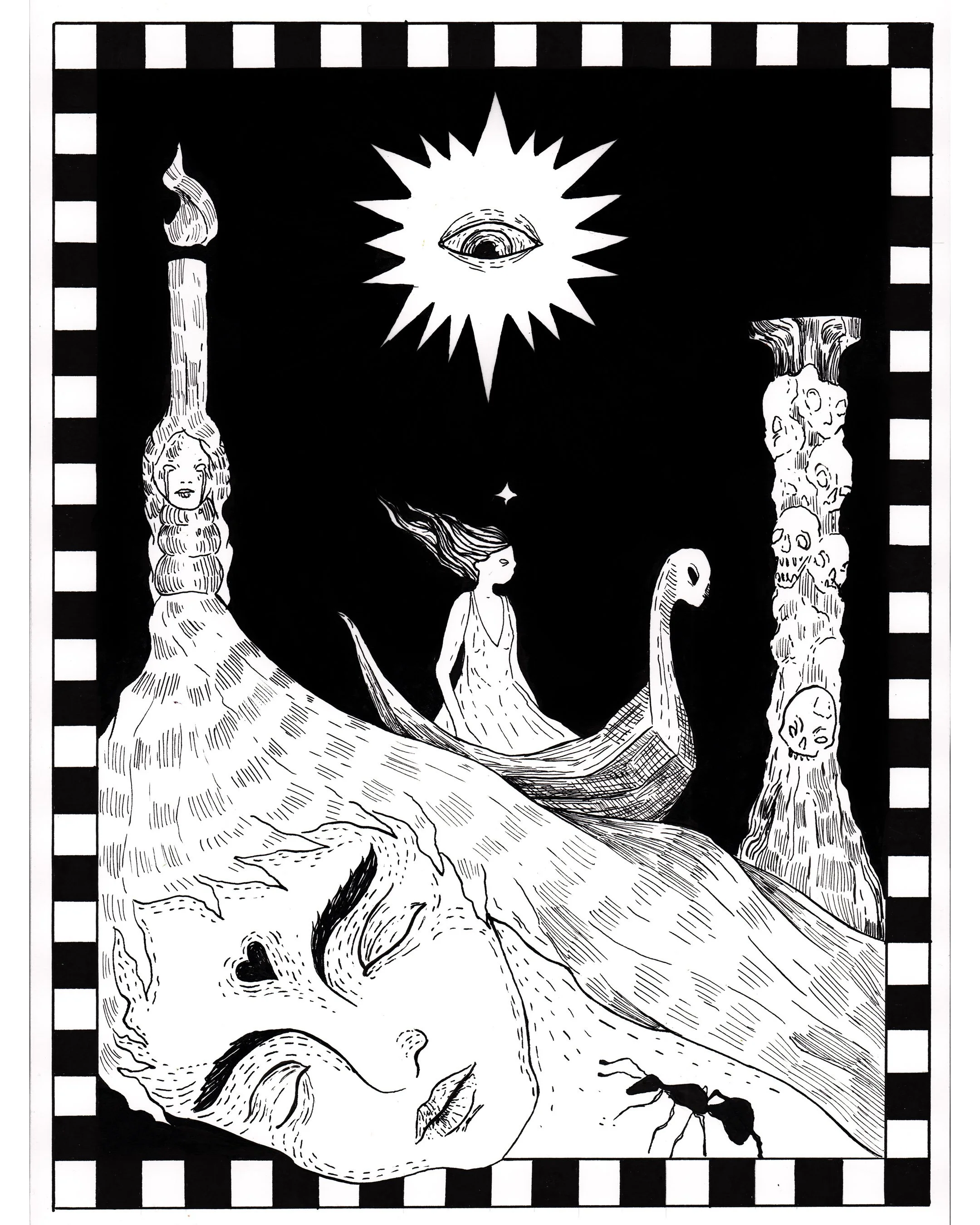 This ink serie portrays Persephone, Psyche and Hecate, three figure who crossed hell and returned. These women are not defined by their descent but by their return. Each drawing becomes a quiet emblem of transformation and a way to resilience. The fine lines and geometric compositions unfold like symbolic architectures and suggesting paths of the inner chambers.